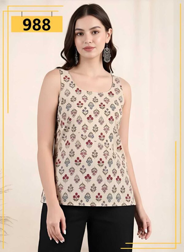 The subtle beige base with elegant printed motifs creates a refined yet fashionable appeal. The sleeveless design enhances comfort while giving the outfit a modern touch. Whether styled for casual wear or smart everyday fashion, this top delivers effortless sophistication.