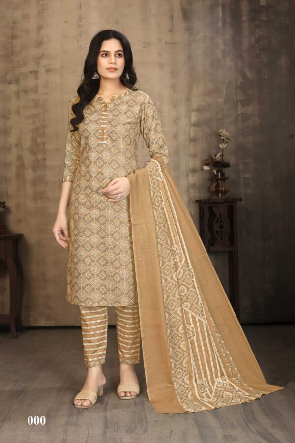 The flattering V-neckline and regular straight silhouette offer a timeless look, while the breathable pure cotton fabric ensures all-day comfort. Paired with coordinated printed cotton pants and a soft matching cotton dupatta, this ready-made set creates a refined and perfectly balanced ethnic outfit.