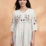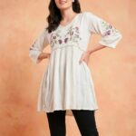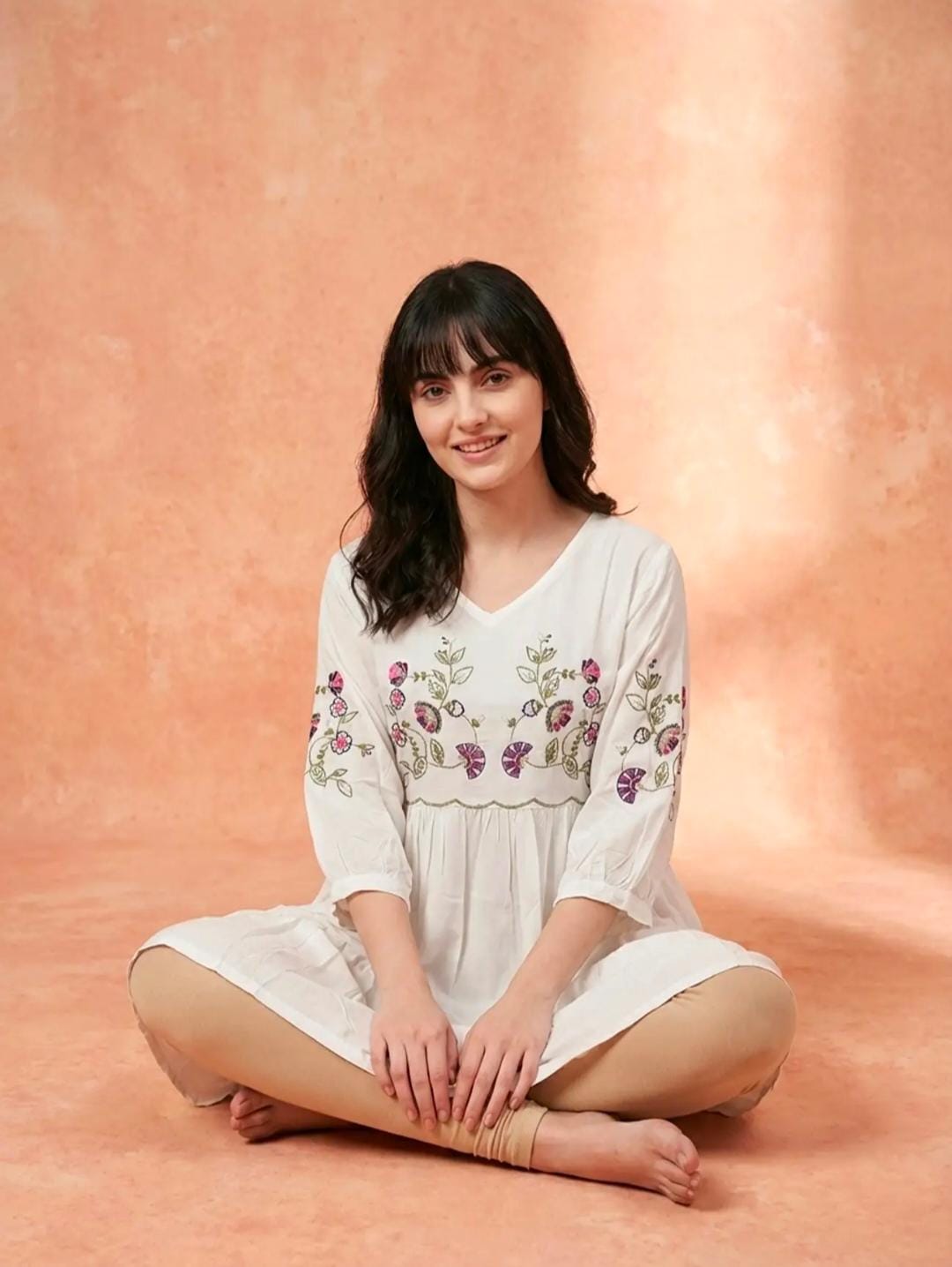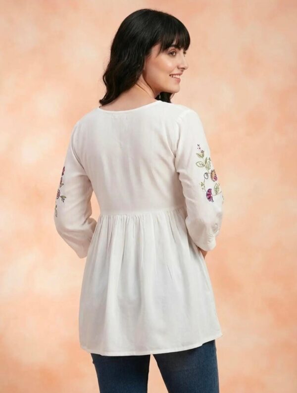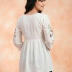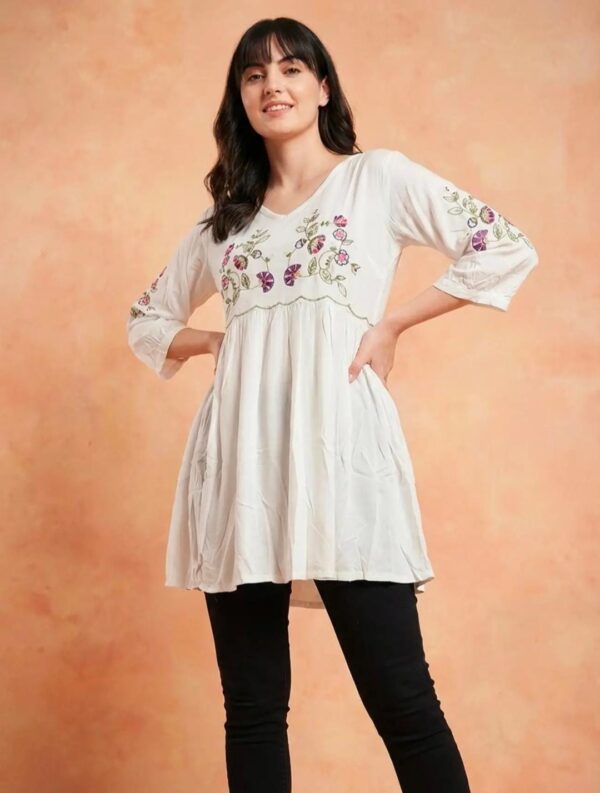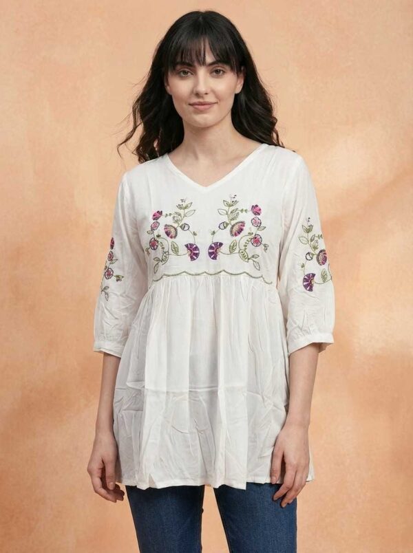 Elegant white embroidered rayon top with 3/4th sleeves. Soft, breathable, and perfect for casual, office, or festive styling.