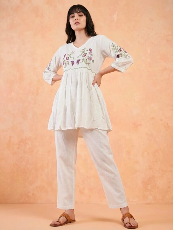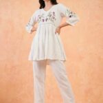 Made from premium-quality soft rayon fabric, it feels lightweight and breathable, perfect for all-day wear. The delicate floral embroidered print on the front and sleeves adds a refined feminine touch, while the gathered flare silhouette enhances its flowy, flattering fit.