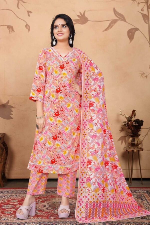 The flattering V-neckline enhances the neckline gracefully, while the straight silhouette and regular length provide a comfortable and stylish fit. Paired with coordinated printed pants and a beautifully designed cotton dupatta, this outfit creates a complete look perfect for festive gatherings, casual outings, or daytime celebrations.