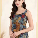 The eye-catching patch-style print combines traditional motifs with modern aesthetics, giving this top a fashionable ethnic twist. Its sleeveless cut enhances comfort and adds a trendy, contemporary touch to your outfit.