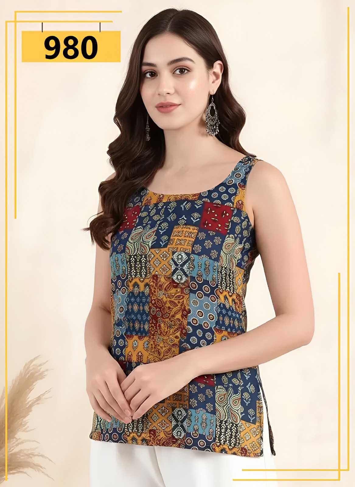 Multicolor printed rayon sleeveless top for women. Lightweight, breathable & perfect for summer casual and Indo-western styling. Shop now at RosaFashion.in.