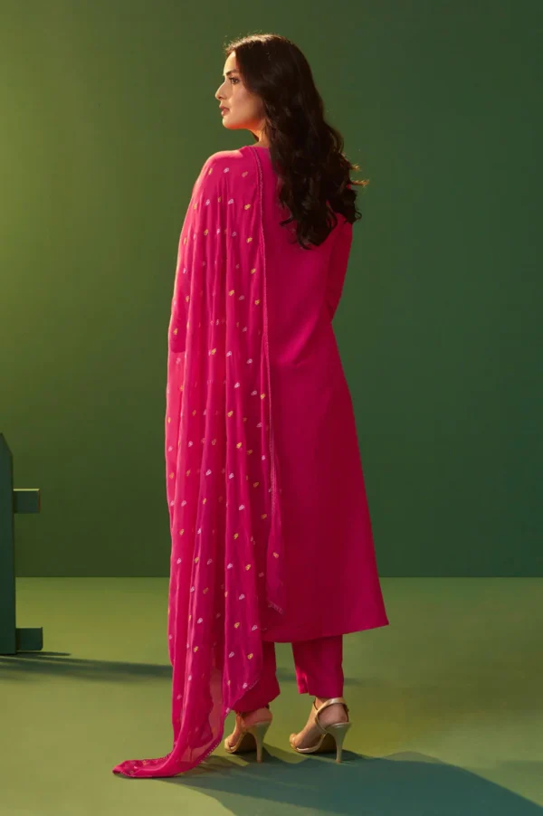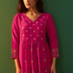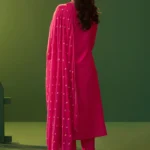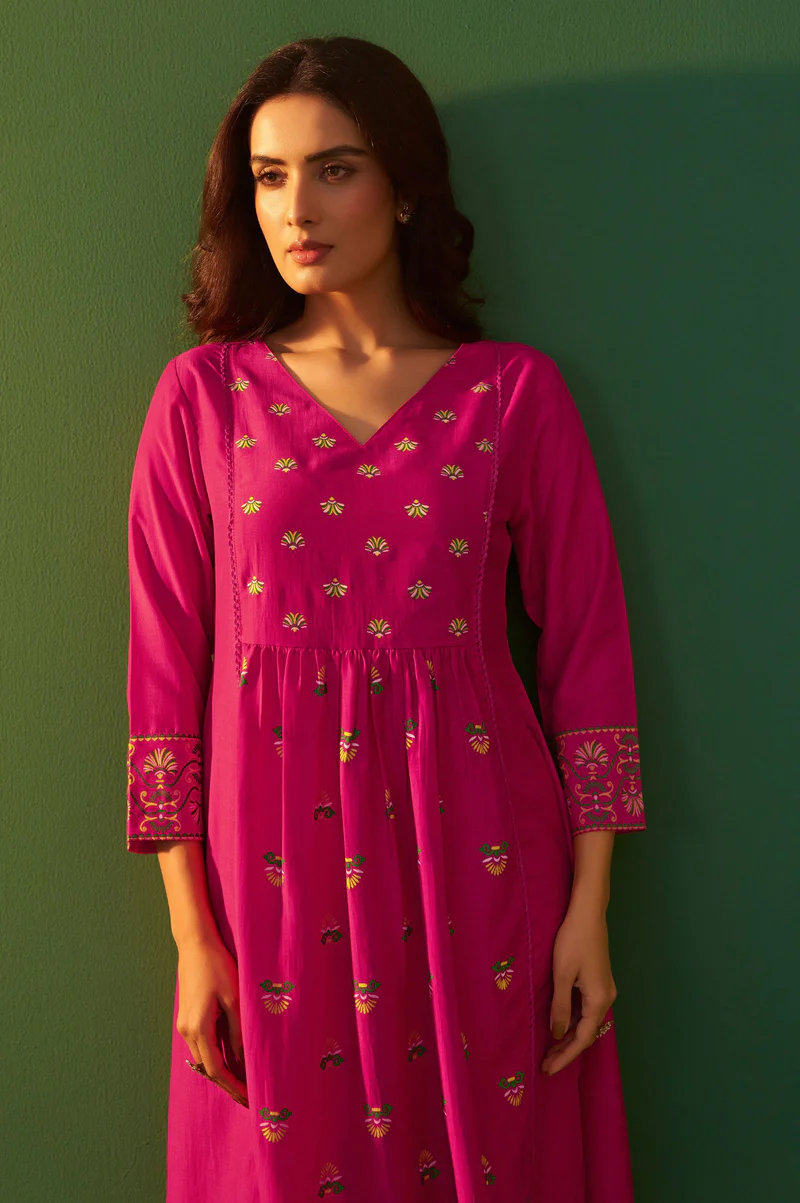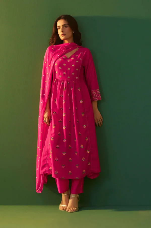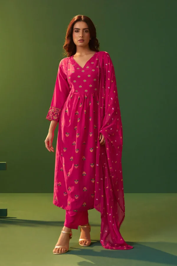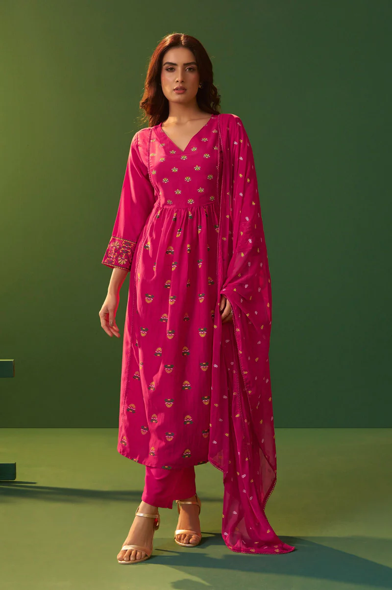 The set is paired with a solid pink cotton bottom tailored for breathability and ease of movement, ensuring lasting comfort throughout the day. Completing the ensemble is a matching printed cotton dupatta that perfectly coordinates with the kurta, adding a refined and cohesive touch. Ideal for festive gatherings, casual outings, or everyday elegance, this three-piece set blends vibrant style with all-day wearability.