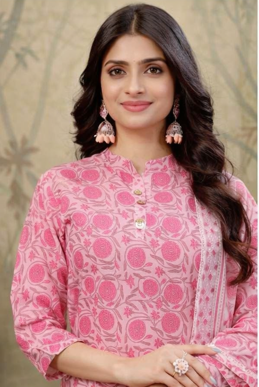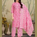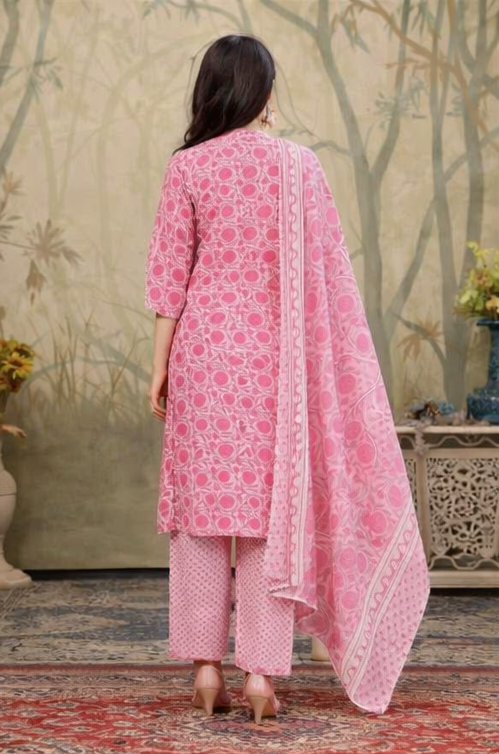 Pink Multicolor Pure Cotton Kurti Pant Dupatta SetPink Multicolor Pure Cotton Kurti Pant Dupatta Set