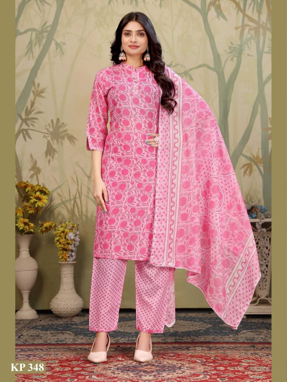 Pink Multicolor Pure Cotton Kurti Pant Dupatta Set