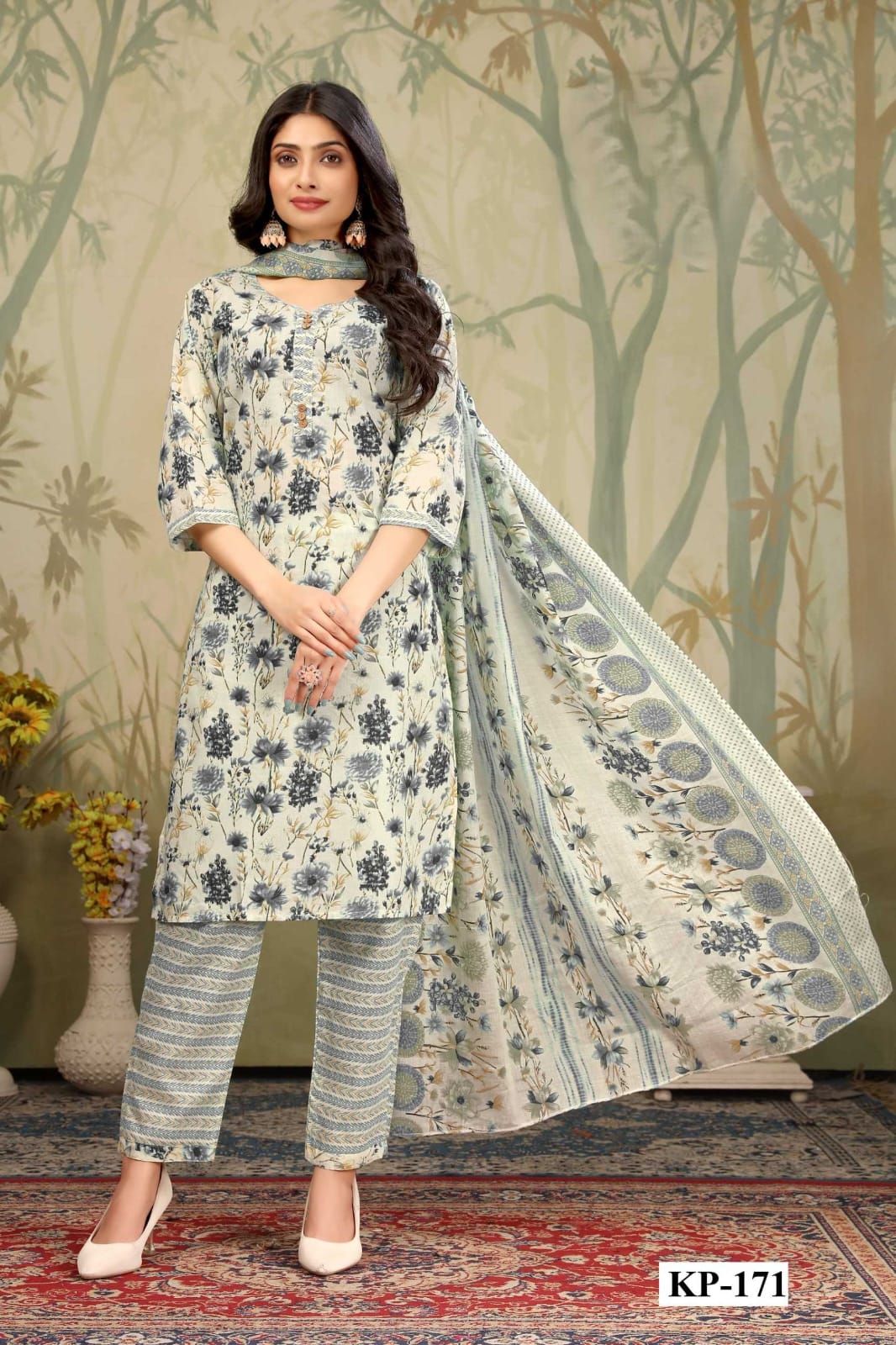 The straight kurti features subtle floral screen print detailing, a flattering V-neck design, and a regular length cut that suits all body types. The matching printed cotton pant adds balance and style, while the coordinated cotton dupatta completes the ethnic look effortlessly.