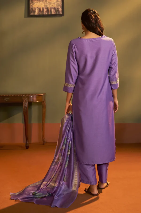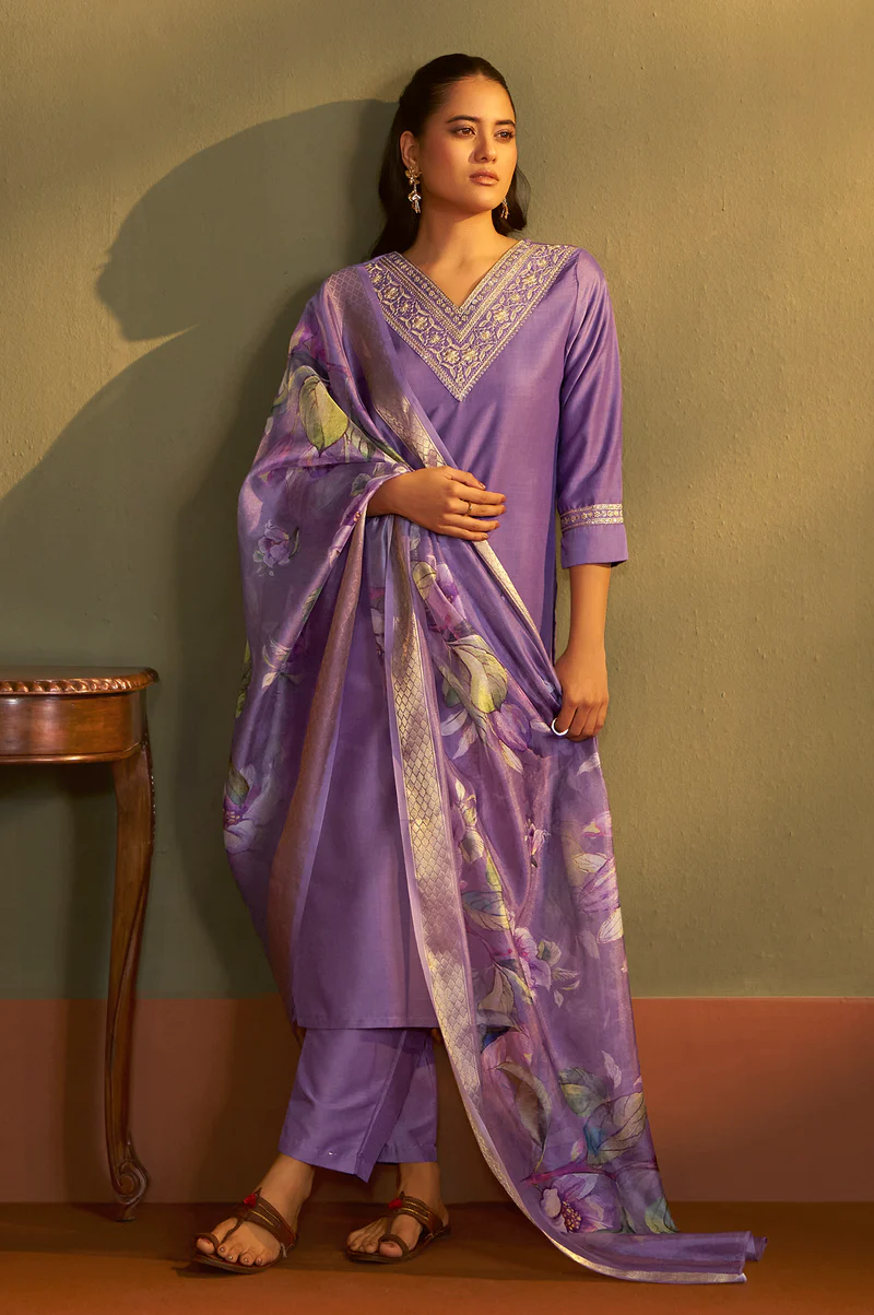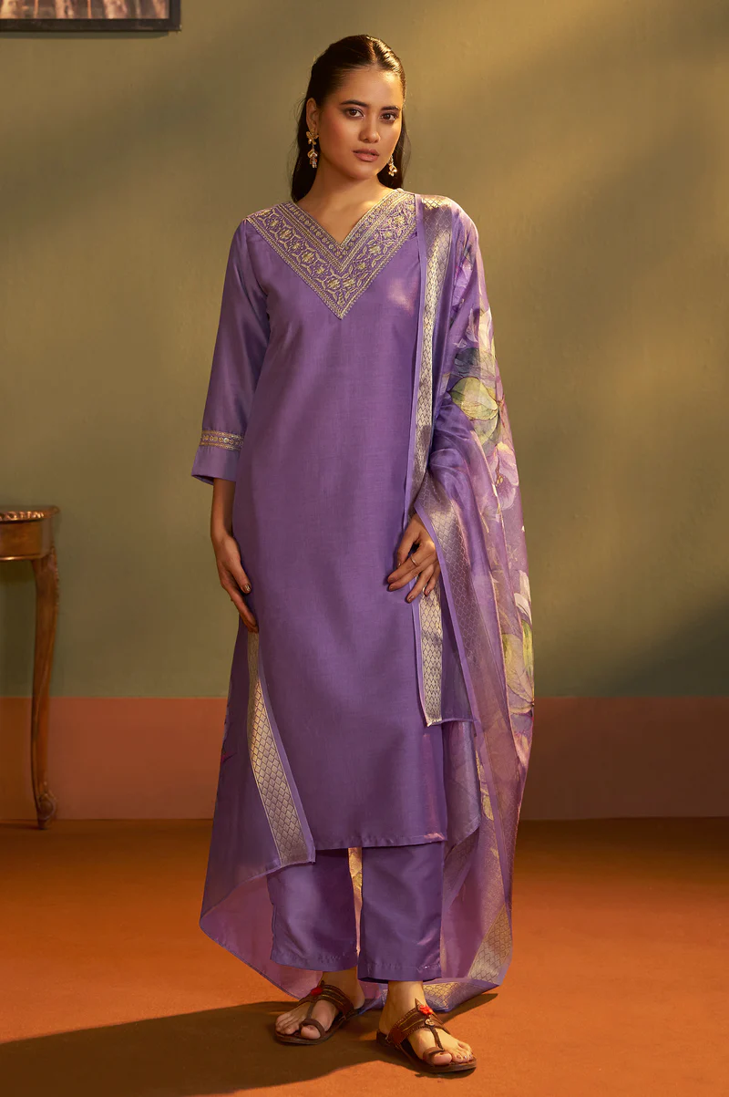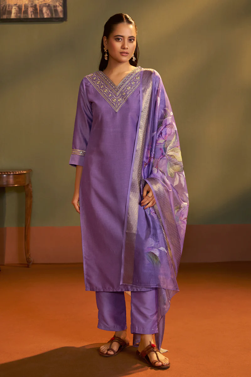 Embrace refined ethnic elegance with this Purple Embroidered Cotton Blend Kurta Set, thoughtfully designed to offer both sophistication and comfort. The straight-cut kurta showcases delicate embroidery that enhances its premium appeal, while the stylish V-neckline and 3/4th regular sleeves lend a contemporary charm. Its calf-length silhouette creates a graceful and flattering fall, making it an ideal choice for festive celebrations, wedding functions, office ethnic days, and traditional gatherings.