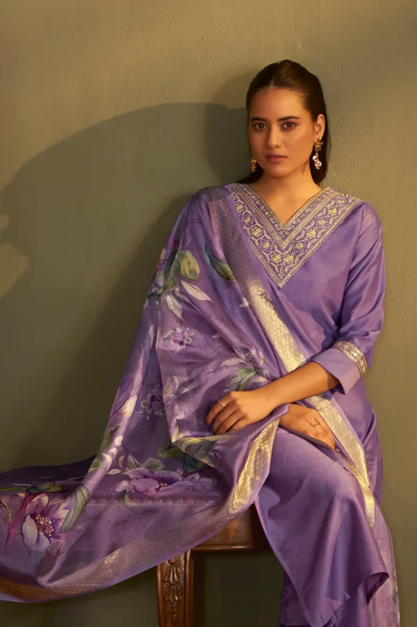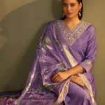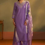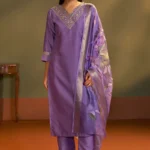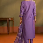 The ensemble is paired with a solid purple cotton bottom tailored for a comfortable, long-length fit that allows effortless movement throughout the day. Adding a touch of festive richness is the lightweight organza jacquard dupatta, beautifully detailed with multicolor prints that elevate the entire look. Crafted from breathable and skin-friendly cotton blend fabric, this set ensures all-season comfort while maintaining a timeless ethnic aesthetic.